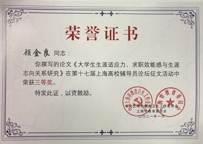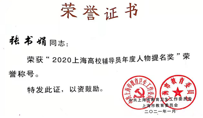 1月14日,由上海市教卫工作党委、上海市教委组织开展的2020年度上海高校辅导员队伍建设月总结会暨第十七届辅导员论坛于上海交通大学举行。我校电子信息学院张书娟老师荣获“2020上海高校辅导员年度人物”提名奖,商学院顾金良老师荣获上海高校辅导员论坛征文活动三等奖,辅导员团队获上海市辅导员团队拓展活动三等奖。 (高杉)