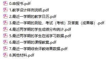 2.课程负责人填写相应课程类型的一流本科课程申报书,以及《上海电机学院一流本科课程申报推荐汇总表》,并向所在二级学院(部、中心)提出申请。电子版申报材料提交要求:申报书及相关附件全部做成PDF文件,以目录的形式,做成一个文件夹。形式如下: