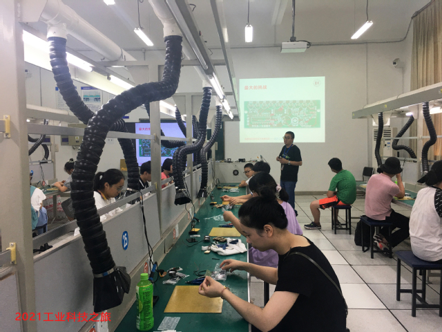 在活动准备和开展过程中,工业技术中心组成了以党员及入党积极分子为主的团队,精心规划本次活动的各项行程,全力保障活动精彩开展。活动以“创新、体验、成长,青春、筑梦、未来”为指导思想,志愿者老师们向学生介绍了世界技能大赛上海市选手集训基地、工业4.0实验室、工业机器人实验室、数控机床和雕刻机等设备,学生对参观内容表现出了极大的兴趣。除此之外,还为学生们安排了实践环节,带领学生体验激光内雕、3D打印技术,指导学生进行电子产品的焊接和机械结构的拆装。作为活动体验项目的成果,同学们亲手焊接并装配的“蓝牙音箱”更可以镌刻上自己的名字带回家。