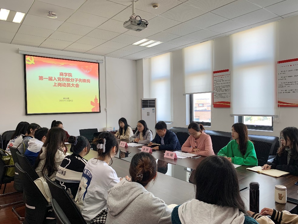 119日下午,在商学院党建活动室召开了商学院第一届“入党积极分子先锋岗”上岗动员会,商学院党委书记金辉、学生工作负责人沈瑾、先锋岗指导老师胡文,以及第一届入党积极分子先锋岗成员代表参加了会议。动员会上,沈瑾老师公布了第一届先锋岗人员名单,同时介绍了先锋岗的设岗目的与考核机制。金辉老师对先锋岗队员提出三点要求:一是提高政治站位,加强学习,不断提高自身思想政治素养和综合素养;二是立足工作岗位实际,珍惜实践锻炼机会,保质保量完成工作内容;三是从一点一滴小事做起,勇于坚守,不怕平凡,勇做先锋,敢为人先,树立入党积极分子的良好形象,以自己的实际行动争取早日成为一名共产党员。