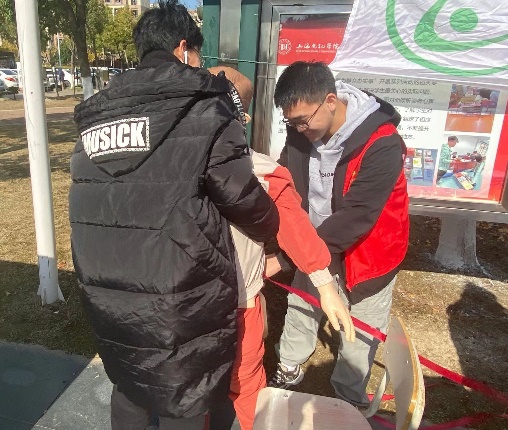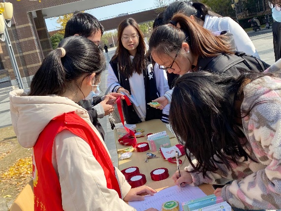 为体现防艾反歧视的人道观念,活动现场还进行了暖心互动,参与活动的同学们可以通过拥抱模拟艾滋病患者的假人来传递拥抱不会传染艾滋病的知识,鼓励大家用正常的态度对待艾滋病人。校红十字会志愿者热心讲解了红丝带的含义,将制作的红丝带分发给同学们。现场同学纷纷在红丝带、海报上签名留言,现场气氛热烈。