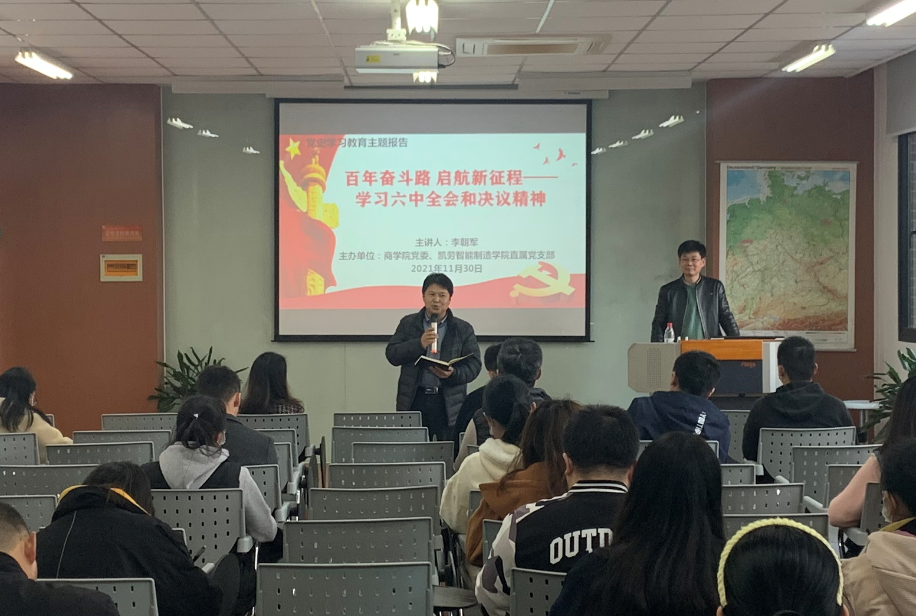 2021年11月30日下午,商学院党委、凯劳智能制造学院直属党支部在中德楼101报告厅联合开展了11月主题党日校级观摩活动暨十九届六中全会精神专题学习。商学院、凯劳学院师生党员以及其他党组织师生代表等参加专题学习,活动由商学院党委书记金辉主持。