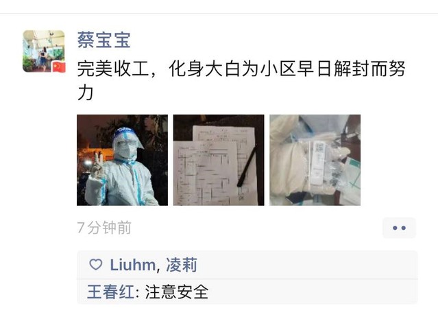 为加快检测速度,小蔡在她负责的两个门洞之间来回奔跑,历经三个多小时,到晚上21:30终于收集齐备了两个门洞共68人的抗原检测阴性记录,因为大白防护服并不透气,她的衣服早已被浸湿了大半。