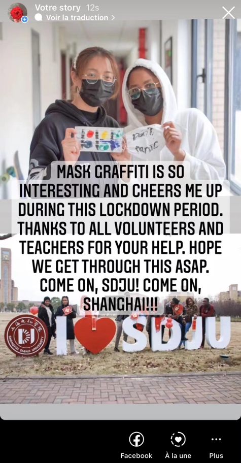 来自赤道几内亚的国贸2031班AGUSTIN同学今天有些焦虑:“我的签证快到期了,早上看到班主任转发了中心公众号推送的关于上海市公安局出入境办证大厅暂停对外接待服务的通知,我很担心,不知道该怎么办。” AGUSTIN刚和班主任发完信息,招生及签证中心的张晖老师已经出现在了他的寝室门口,而这样的巧合在国际学生公寓并不是偶然。校园准封闭管理期间,国教中心时刻关注学生合理诉求和心理健康,组织了一系列暖心工程。中心领导和学院教师走进学生公寓关心国际学生们,组织志愿者定期驻扎在学生公寓大厅,宣传疫情防控最新要求、零距离提供各种帮助,同时国教中心开通新媒体账号和合理诉求在线反馈平台,全力保障国际学生的校内生活。针对校外、境外的国际学生,国教中心部署学生辅导员一对一关怀,时刻掌握学生动态。此外,国教中心还搭建了国际学生工作坊,组织中外学生开展系列抗疫主题活动,鼓励国际学生展示自己的抗疫生活,讲述自己的抗疫故事,分享在校园生活中感受到的中国力量。来自科摩罗的MOINA就是国际学生工作坊的成员之一,在参与了以“美”搏“疫”为主题的创意口罩绘制活动后,她第一时间在自己的社交媒体账号上发表状态:我从口罩涂鸦活动中倍受鼓舞,心情瞬间愉悦了许多。感谢志愿者和老师们在防疫过程中提供的种种帮助,相信我们一定能很快渡过难关,上海电机学院加油!上海加油!