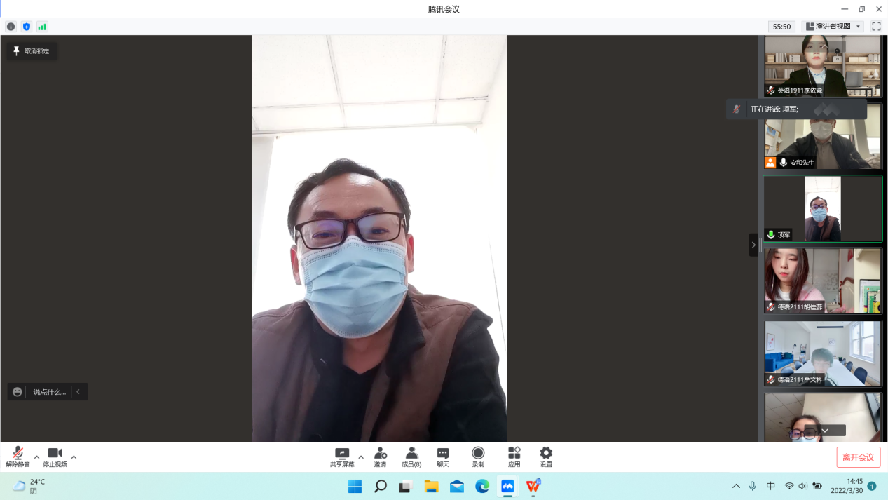 为扎实做好校园疫情防控下的学生心理健康教育工作,加强学生心理疏导与人文关怀,解决疫情期间遇到的现实难题,促进同学们的身心健康发展,3月30日下午14点,外国语学院召开“云上会客厅”线上师生交流会,以视频连线方式与校内外的学生代表及海外留学生代表进行沟通交流。学院党总支书记项军、副书记甄一捷,海外留学生代表及各年级学生代表参加交流。交流会由学院团总支书记余志鹏主持。