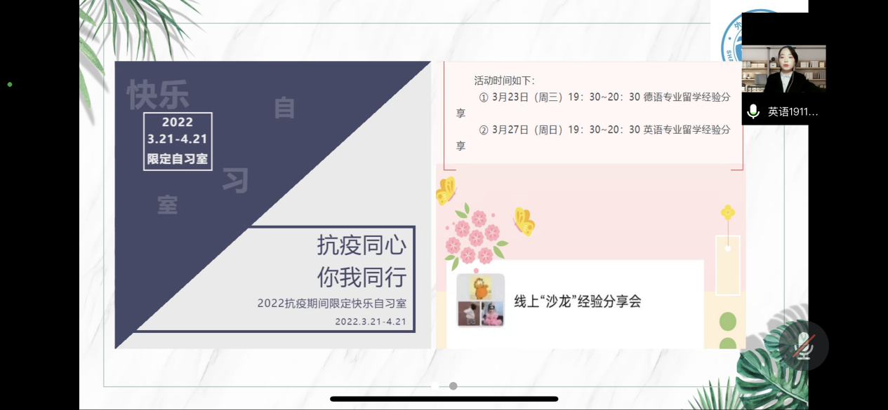 学生会团总支副书记李依淼同学从“疫”起学习、疫情“怡”刻、抗疫有我、以艺战“疫”四个方面,进行了封闭管理期间外国语学院团总支学生分会的工作汇报,详细介绍了疫情期间学生会的各项工作与活动筹备计划,引领青年学子在抗击疫情中勇于担当作为,传承爱国精神,贡献青春力量,助力校园抗疫。