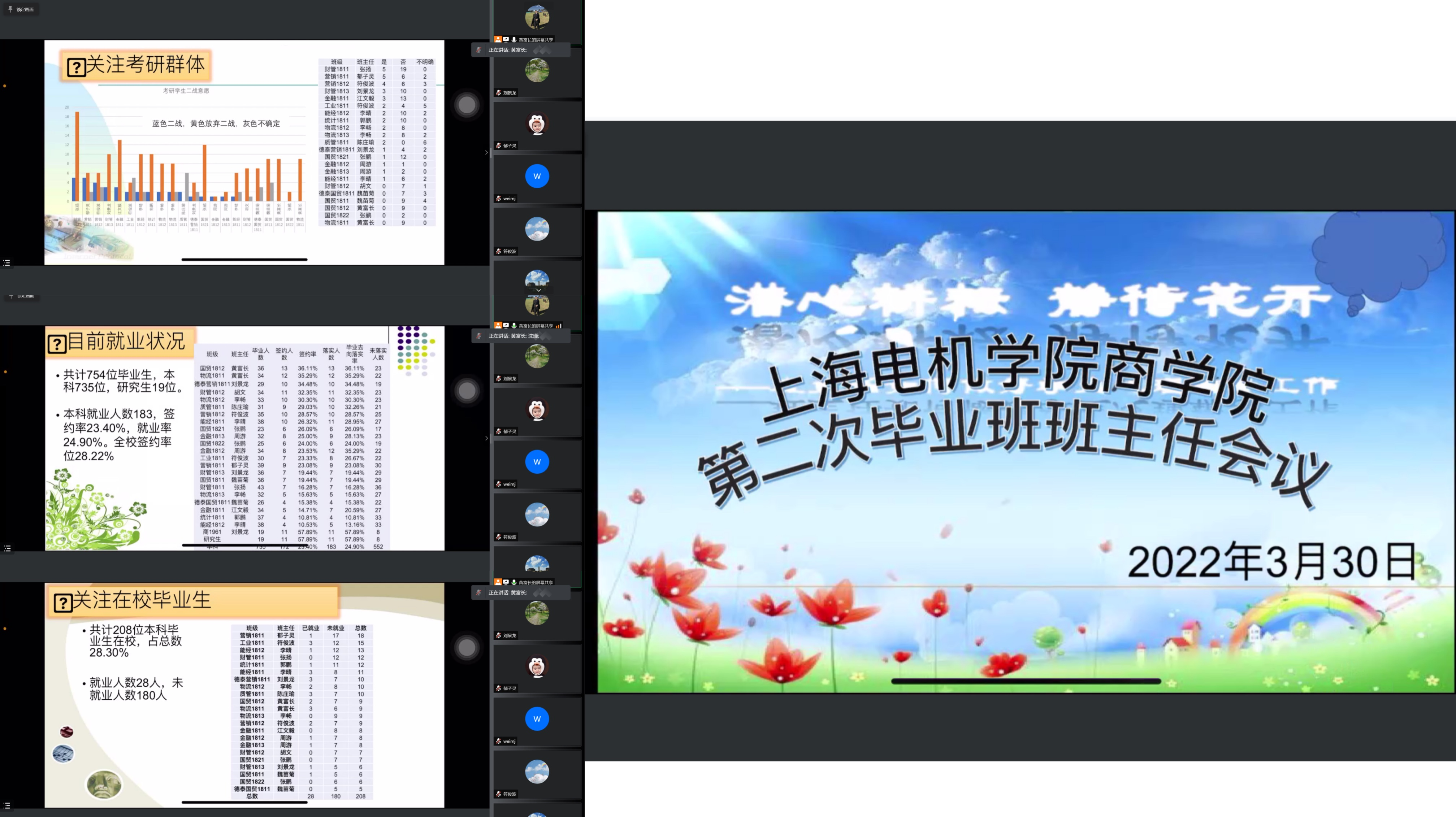 针对当前疫情形式的严峻性和不确定性,为更好开展毕业班就业工作,了解学生们的就业意向与需求,解决班主任们在开展就业工作中的难处,3月30日下午,商学院召开了2022届毕业班第二次班主任会议。学院党委书记金辉,党委副书记、副院长沈瑾及毕业班班主任们参加会议。