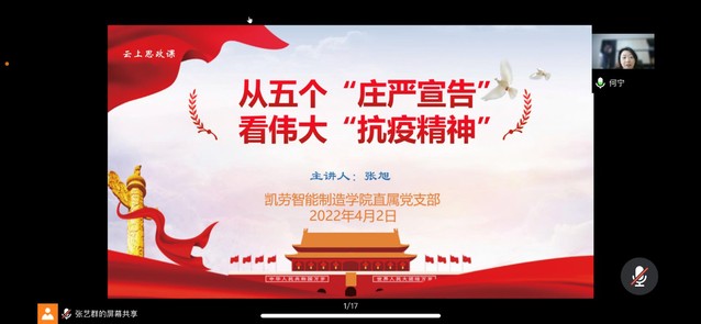 4月2日下午,凯劳智能制造学院 “云上思政课”开讲。上上海市第二届女性教育教学能力评选“十佳教学能手”、凯劳学院思政指导老师、马克思主义学院青年博士张旭副教授做了主题为“从五个‘庄严宣告’看伟大抗疫精神的报告。“云上思政课”由凯劳学院直属党支部书记何宁主持,凯劳学院全体党员师生、入党积极分子、学生共计150余人参加学习。