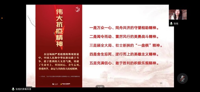 张旭老师首先带领大家重温了习近平总书记在庆祝建党100周 年“七一”讲话中五个“庄严宣告”及其重要意义。“庄严宣告 ”昭示了“坚持真理、坚守理想,践行初心、担当使命,不怕牺牲、英勇斗争,对党忠诚、不负人民”的伟大建党精神。紧接着,她结合当下上海正在进行的抗疫狙击战,从五个”庄严宣告“出发,对生命至上、举国同心、舍生忘死、尊重科学、命运与共的伟大抗疫精神做了五方面阐发:一是万众一心、同舟共济的守望援助精神;二是闻令而动、雷厉风行的英雄战斗精神;三十顾全大局、壮士割腕的“一盘棋“精神;四是舍生忘死、逆行而上的英雄主义精神;五是充满信心、敢于胜利的积极乐观精神。张旭老师还特别提到,近期学校每位师生都在用自己的方式贡献对抗疫情的力量。