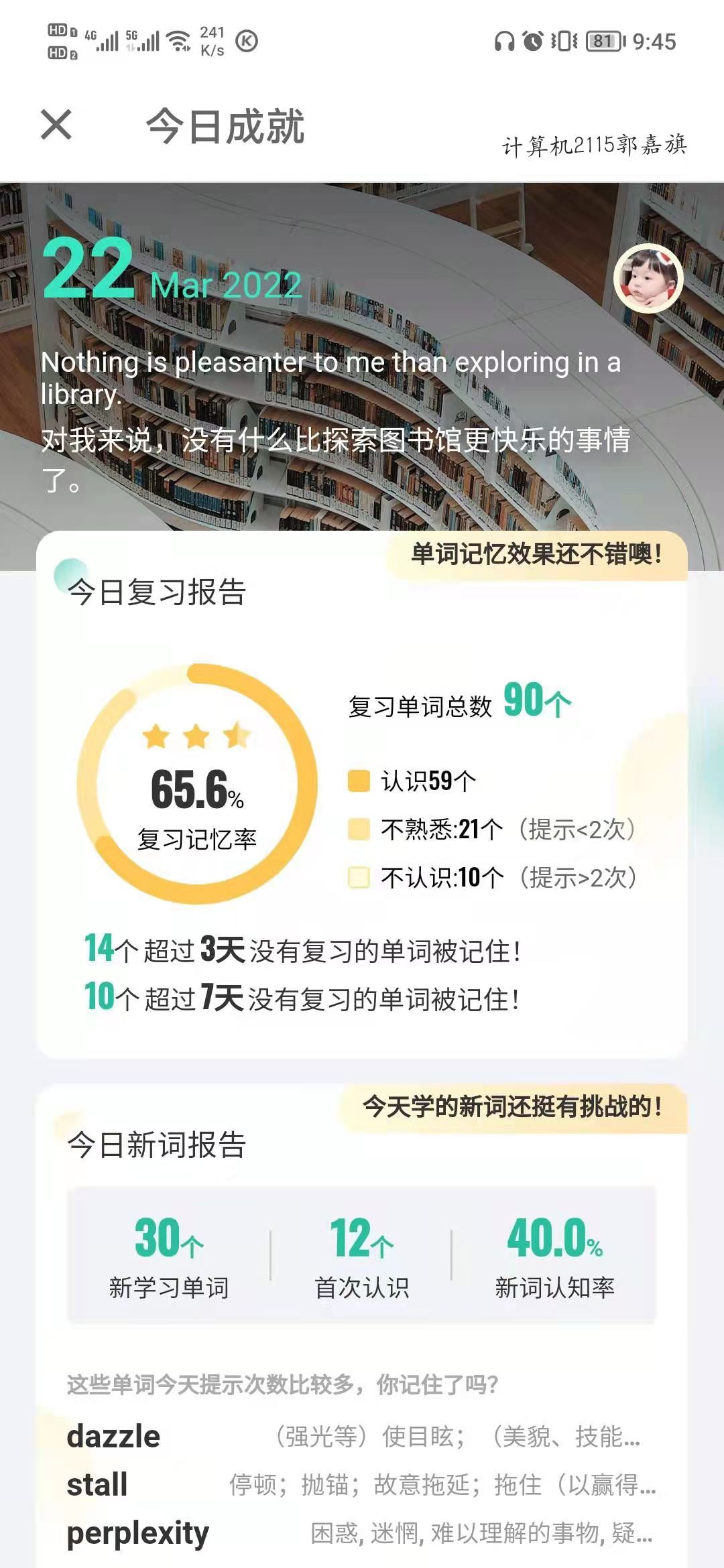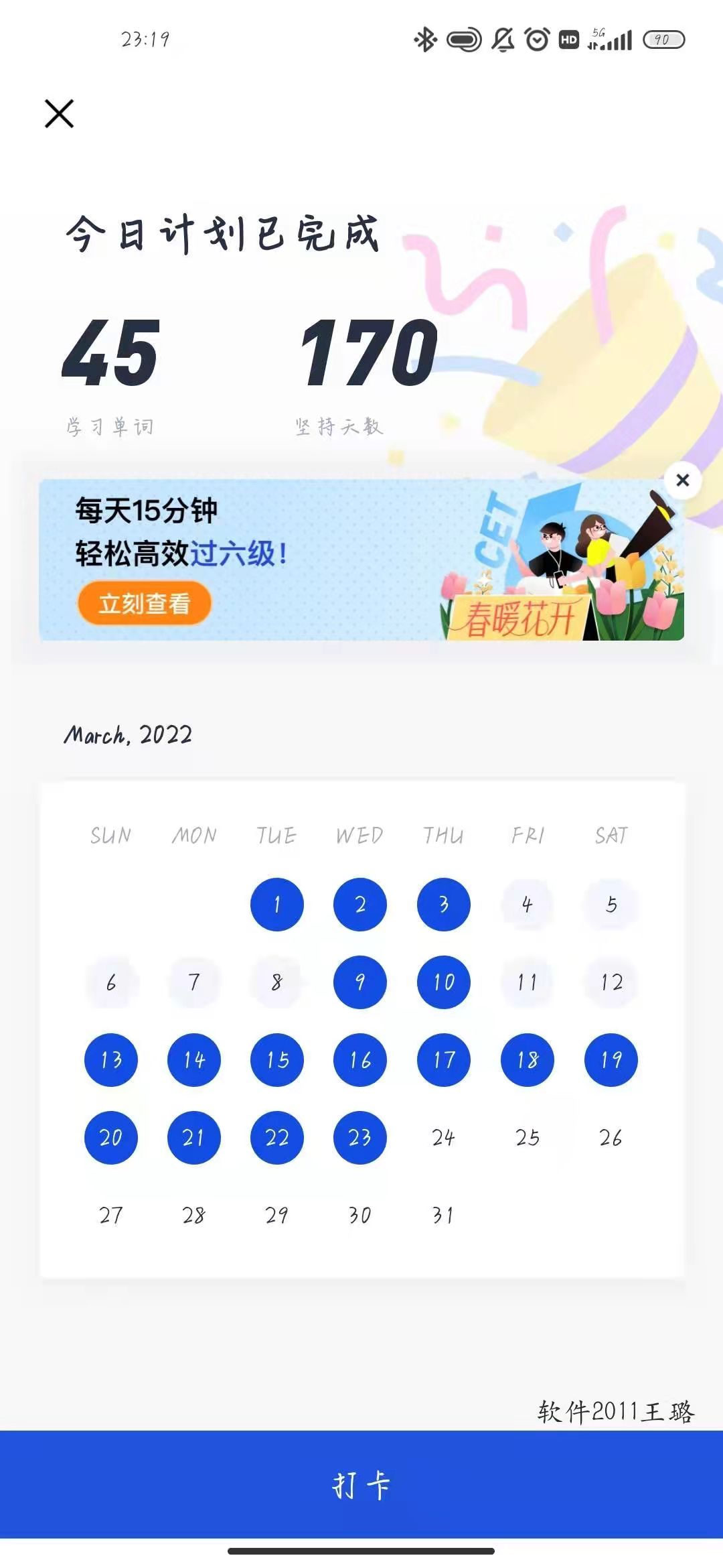 为了推动同学们更好地利用好碎片时间,做好时间管理,更加自信地备战迎接四六级考试,丰富词汇量,提升英语水平,也为了帮助同学们养成良好的习惯,电子信息学院近期开展了“线上单词打卡”活动,督促同学们养成每天单词打卡的好习惯,真正提升自己的英语水平。100余名同学参与了本项挑战赛,大家纷纷表示,挑战赛使自己英语学习不孤单了,更加有动力啦!