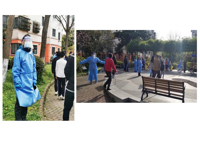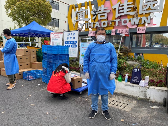张志玺老师加入宜浩佳园一居委志愿者服务队,帮助小区居民配送快递和生鲜,解决生活必需问题。同时,变身为社区防疫“大白”,配合医疗队完成社区的核酸检测工作。