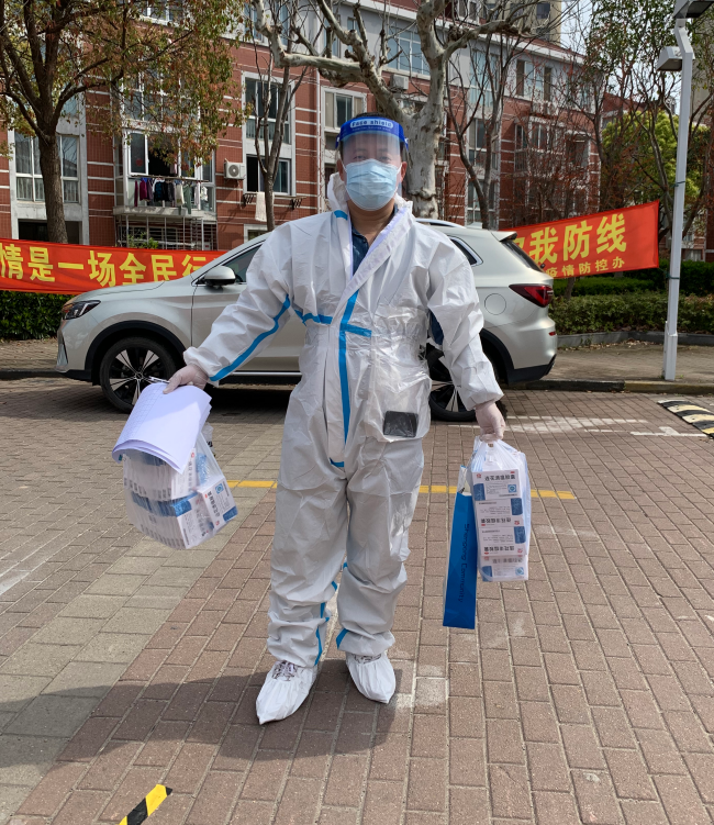 辅导员王海明在社区化身为“快递小哥”,将快递消毒后派送到居民家门口。“团购的物品要确保做好消毒再派送到居民手中,送货服务的最后一公里值得我拿出十分的用心”。