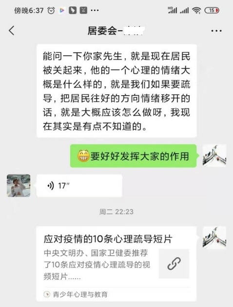 辅导员徐雷和爱人都投入到社区志愿服务中。徐雷发挥他心理咨询师的专业优势,不仅在教育部网上热线开展疫情下的线上咨询与服务,还为社区居民提供暖心的心理疏导服务。“疫情下我们需要及时普及心理健康知识,为居民解疑释惑,稳定群众情绪,防止社会恐慌,我们一定能打赢这场没有硝烟的战争”。
