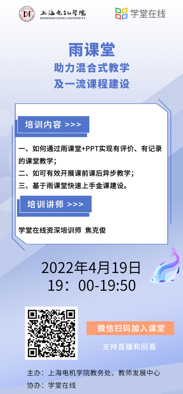 为应对目前疫情形势,进一步保障我校线上教学顺利开展,确保线上教学质量,也为在线教学资源、教学过程做数据留存,特邀清华大学雨课堂平台为老师们提供线上教学培训,欢迎感兴趣的老师们积极参加。