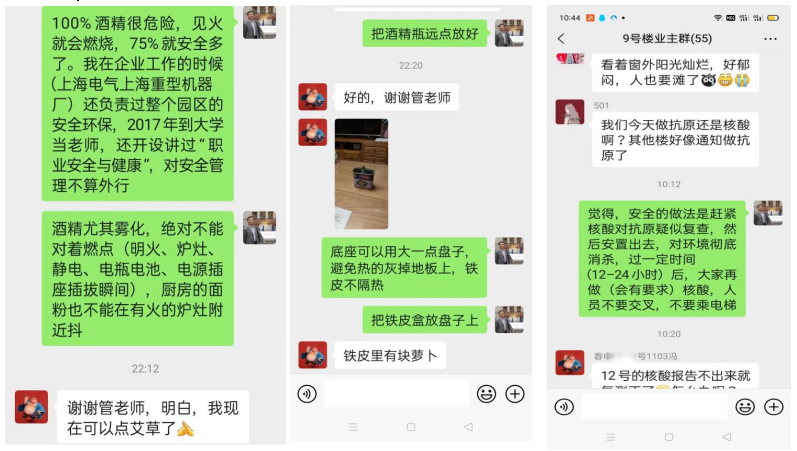 面对所在小区疫情较为严重的实际情况,管仲毅老师在协助居委会和志愿者做好楼群防疫安全管理的过程中,亲笔撰写了《关于楼栋有阳户尚未转运期间的应急管理》《快递物品安全消毒及防护》等帖子,通过网络微信形式将应急处置建议和科普防疫知识及时推送给社区邻里,帮助大家有效提高科学防范能力。