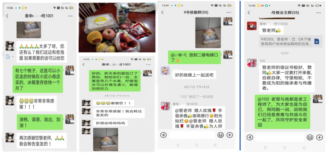在参加社区志愿服务过程中,管仲毅老师一方面积极协助楼组长进行“阳户”核酸复检,为有“阳户”的楼栋建言献策如何进行防疫阻断,安抚和引导他们以积极心态面对病毒、战胜病毒。一方面把家里的N95口罩捐赠出来,帮助居委会工作人员和志愿者提高防护力度,同时还把水果、蛋糕、面包、饮料等赠送给急需补充营养的邻居,用实际行动践行了一位共产党员和高级知识分子的责任与担当。他悉心的指导,及时的赠送,温馨的话语也受到了社区邻里的广泛点赞。