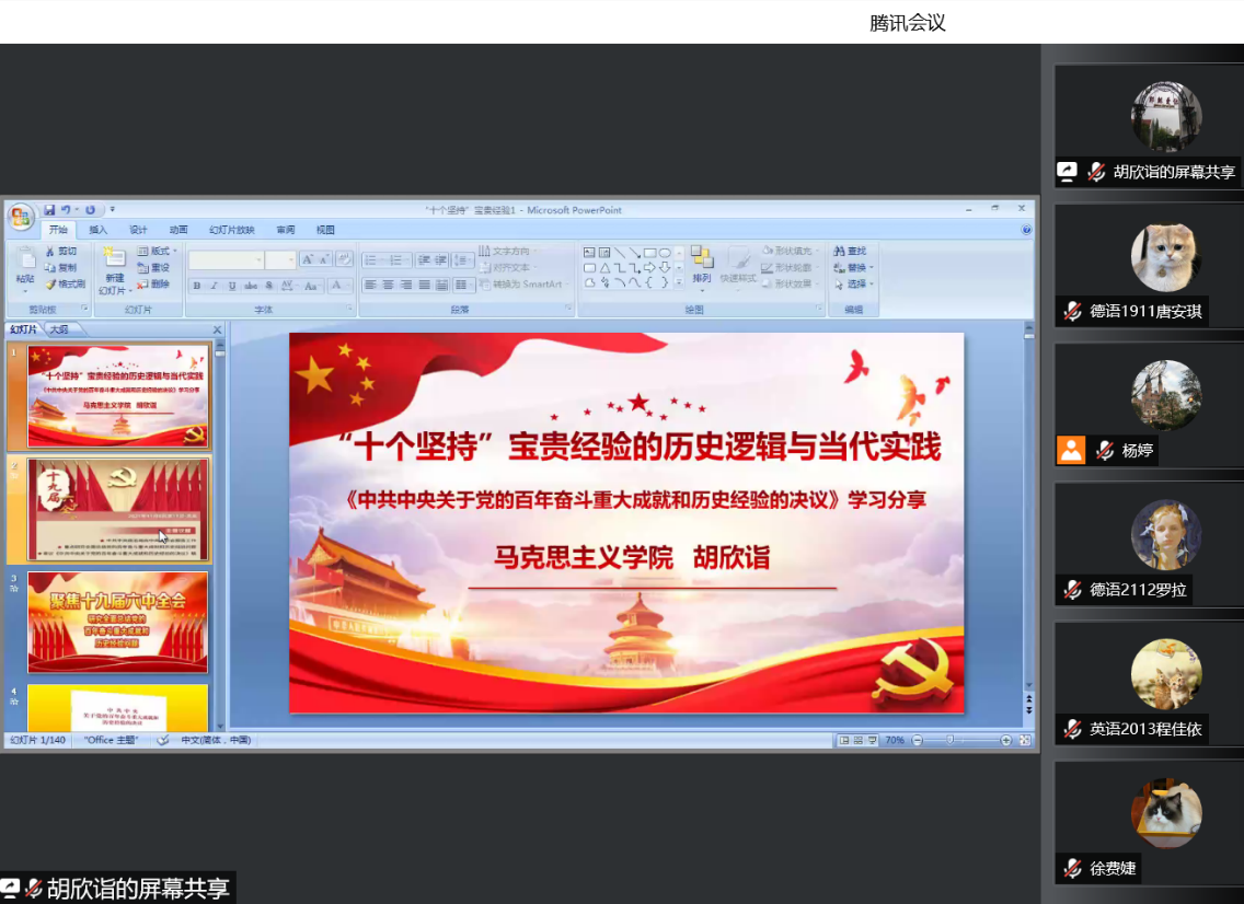 为了使师生更好地理解“十个坚持”宝贵经验的历史意义,在疫情防控中不断传播正能量,4月22日下午,外国语学院党总支开展了“思政大课堂”,主题为“‘十个坚持’宝贵经验的历史逻辑和当代实践”。此次大课堂由学院思政导师、马克思主义学院胡欣诣老师讲授,370余名学院师生代表参加。