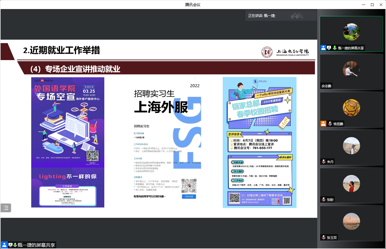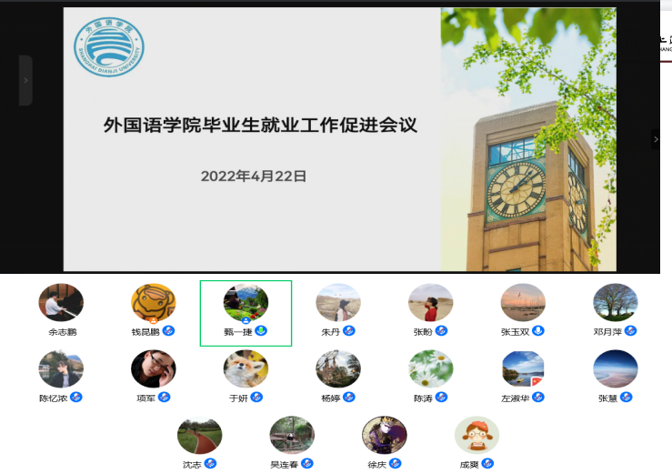 为全力做好疫情防控期间的毕业生就业指导服务工作,抓住当前毕业生就业冲刺期,为毕业生提供精准就业帮扶指导,4月22日下午13:00,外国语学院召开了2022届毕业生线上就业工作会议。学院党政班子成员、三级机构负责人、系部主任、毕业班辅导员参加会议。会议由外国语学院党总支副书记、副院长甄一捷主持。
