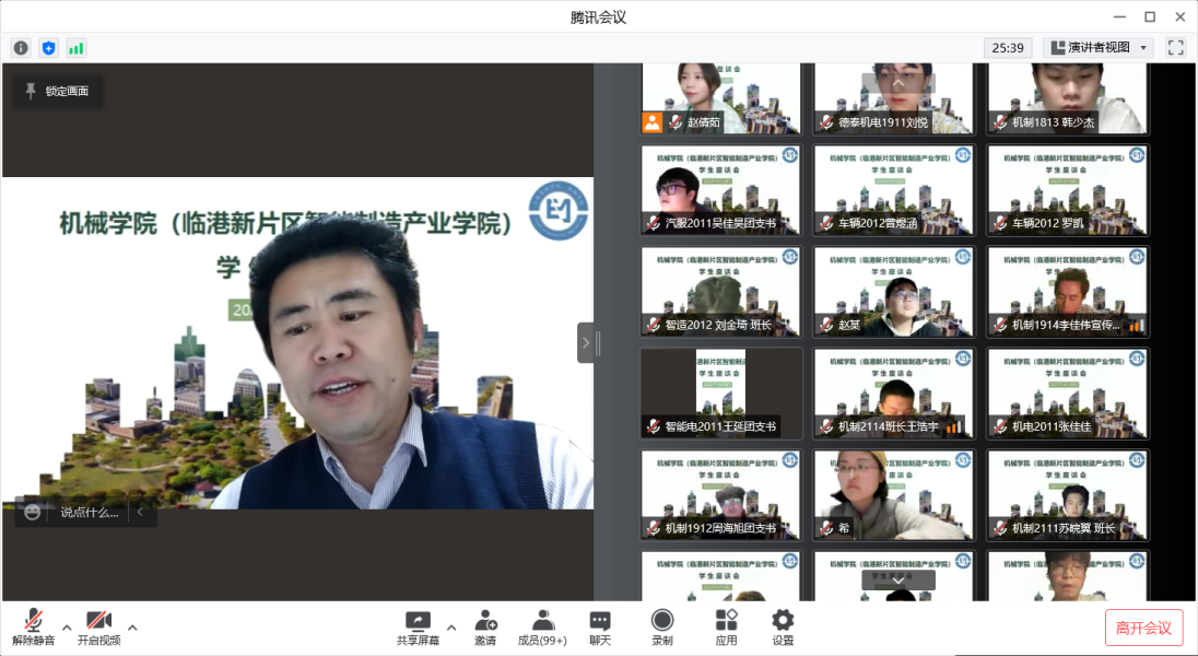 4月29日晚7:30,机械学院(临港新片区智能制造产业学院)组织召开学生座谈会,院长刘军、党总支书记卞一明、副院长张栋、副院长赵爽、全体辅导员及班主任和学生代表参加会议,党总支副书记刘国军主持会议。