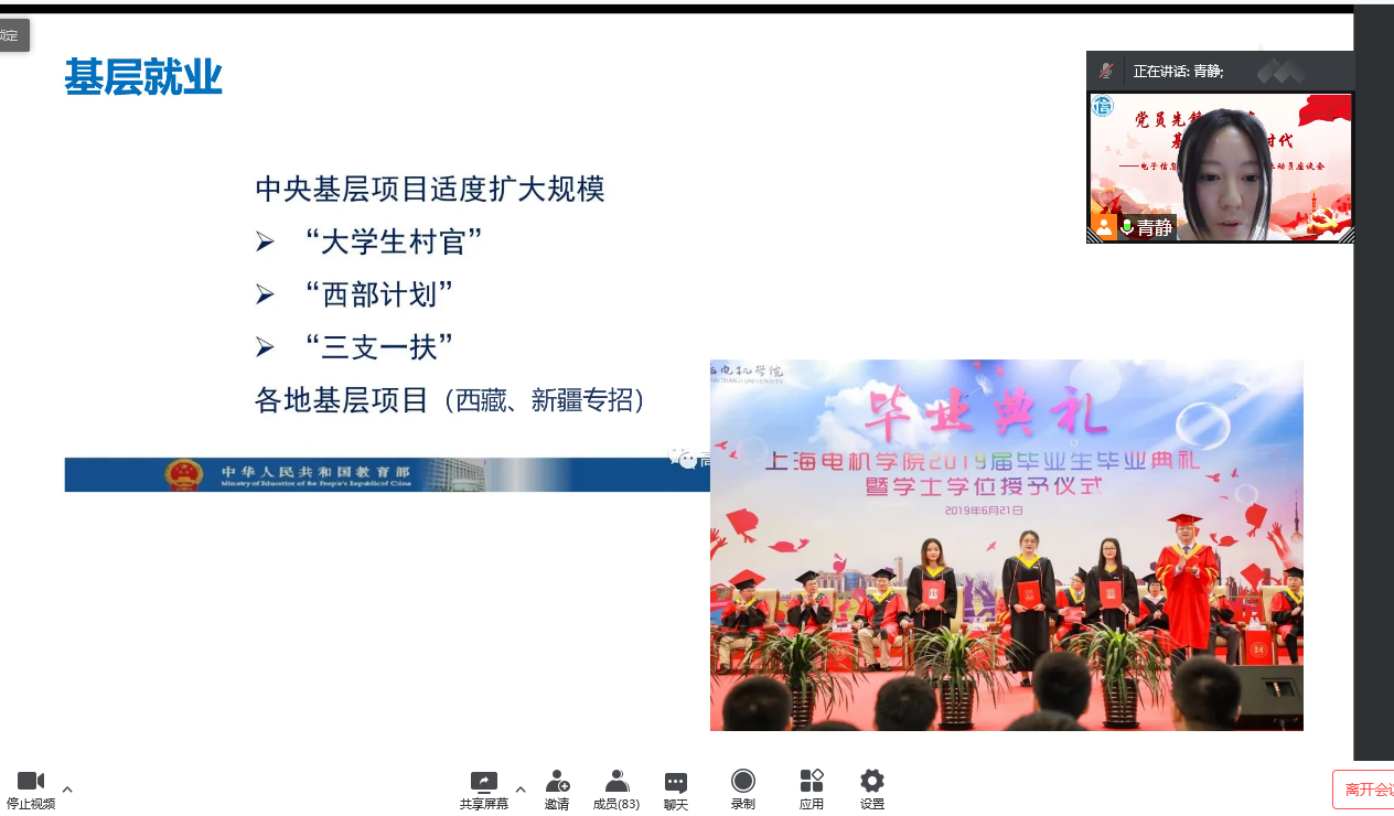 5月6日16:00,电子信息学院在云端召开了学生党员基层就业动员座谈会,学院党政领导、支部书记、就业辅导员、全体学生党员等80余人齐聚云端参会。座谈会由党总支副书记、副院长袁亮主持。