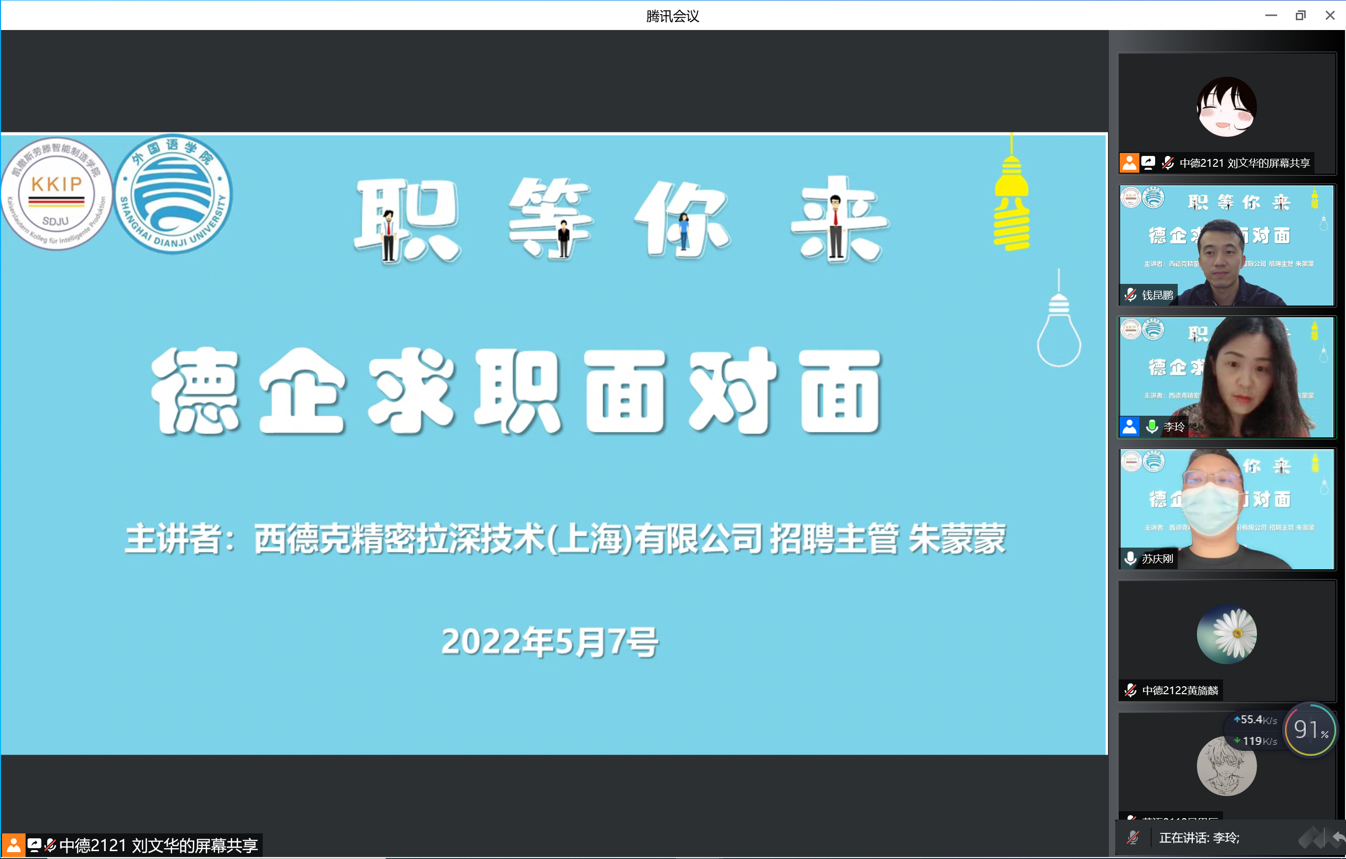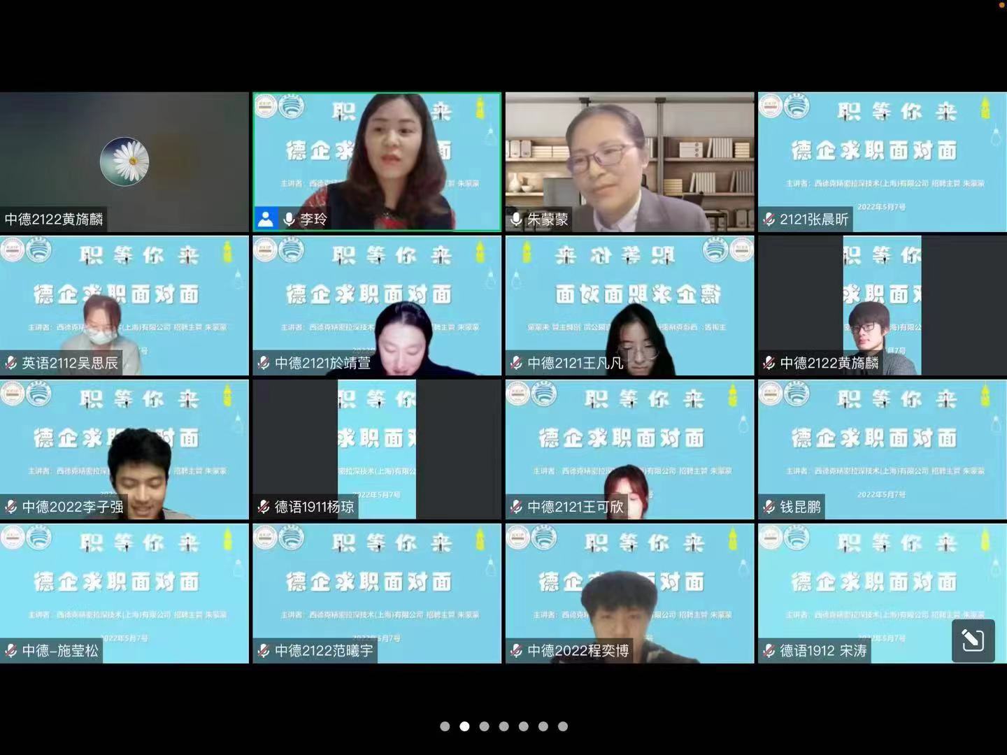 为增强学生德企求职技能,帮助广大同学理清德企职业生涯发展路径,强化职业生涯规划意识,5月7日凯劳学院与外国语学院联合举行“德企求职面对面”线上交流会。本次活动邀请了具有15年人力资源工作经历的西德克精密拉深技术(上海)有限公司招聘主管朱蒙蒙女士前来交流分享,共计150多人参与了线上学习。