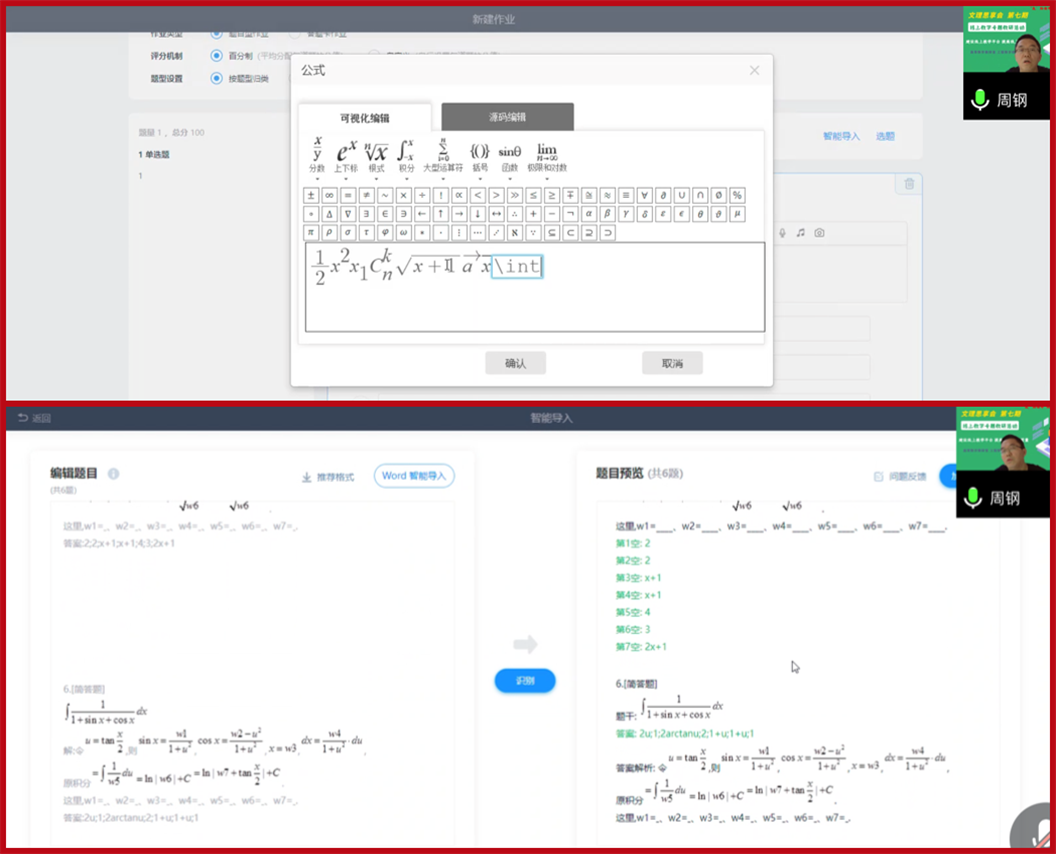 高等数学教研室周钢老师自2020年开始一直致力于线上教学平台的建设,并在课堂教学中予以实践。他在活动中向大家分享了近两年在超星学习通平台上进行线上作业的经验、学生成绩提升情况以及学生对线上作业的接受程度。针对电脑网页或者手机APP难以输入数学符号这一难点,周老师现场向大家演示在超星学习通平台如何通过word模板导入和题目框手动输入不同题型的数学题目,并介绍了作业发布、批改中的一些细节事项。