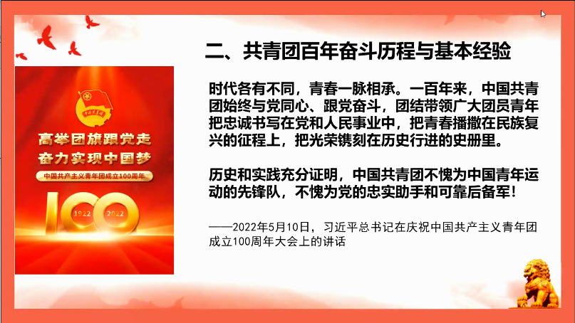 陈兰芝老师做了“学习贯彻习近平总书记在庆祝中国共产主义青年团成立100周年大会上重要讲话精神”的主旨发言,围绕共青团的初心和使命、共青团百年奋斗历程与基本经验、新时代加强共青团工作的基本要求以及引领青年在民族复兴伟业中以青春奋斗担当时代使命等谈了学习体会。石建水老师、刘妤老师、陆建松老师和罗薇老师分别从如何结合国际形势与疫情防控要求落实立德树人根本任务、如何结合劳动教育培养青年学生艰苦奋斗优良作风、青年的责任使命、发挥思政教师作用等方面谈了学习感受。