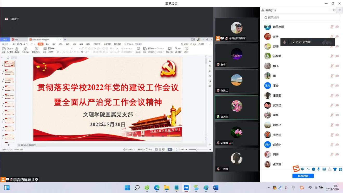 为贯彻落实学校2022年党的建设工作会议暨全面从严治党工作会议精神,5月20日文理学院举行“云上”主题党日活动,进一步统一思想、凝聚共识,推动学院各项工作顺利落实。会议由直属党支部书记康秀珠主持,学院全体党员及党风监督员参加。
