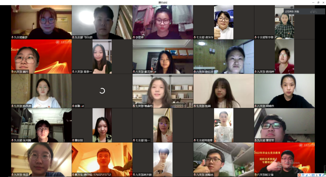 三位在基层工作的党员校友分享了他们在不同岗位上挥洒汗水、奋勇争先的经历。在重庆市黄水镇政府工作的西部志愿者郭淑熙动情地说,“脚底沾满泥土是我的工作常态”;在中国人民解放军服役的校友赵建华体会到,军事训练绝不只是简单的摸爬滚打,更是淬火加钢的锤炼,是化蛹为蝶的蜕变。在上海黄浦分局半淞园派出所工作的校友张佳杰,进驻社区连续工作两个月有余,工作中克服了重重困难,一直坚持到的社会面“清零”。“一家不圆万家圆,万家圆时心亦安”,正如张佳杰校友所讲述的这样,党员校友们用自己的实际行动,勇做新时代的弄潮儿,胸怀“国之大者”,担当使命任务,到新时代新天地中去施展抱负、建功立业,脚踏实地,践行着自己的入党初心和青春誓言。