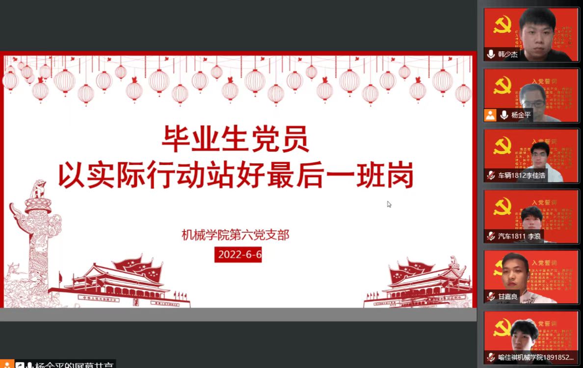 2022年6月6日,机械学院第六党支部围绕“毕业生党员以实际行动站好最后一班岗”的主题,召开了最后一次毕业生党员会议。