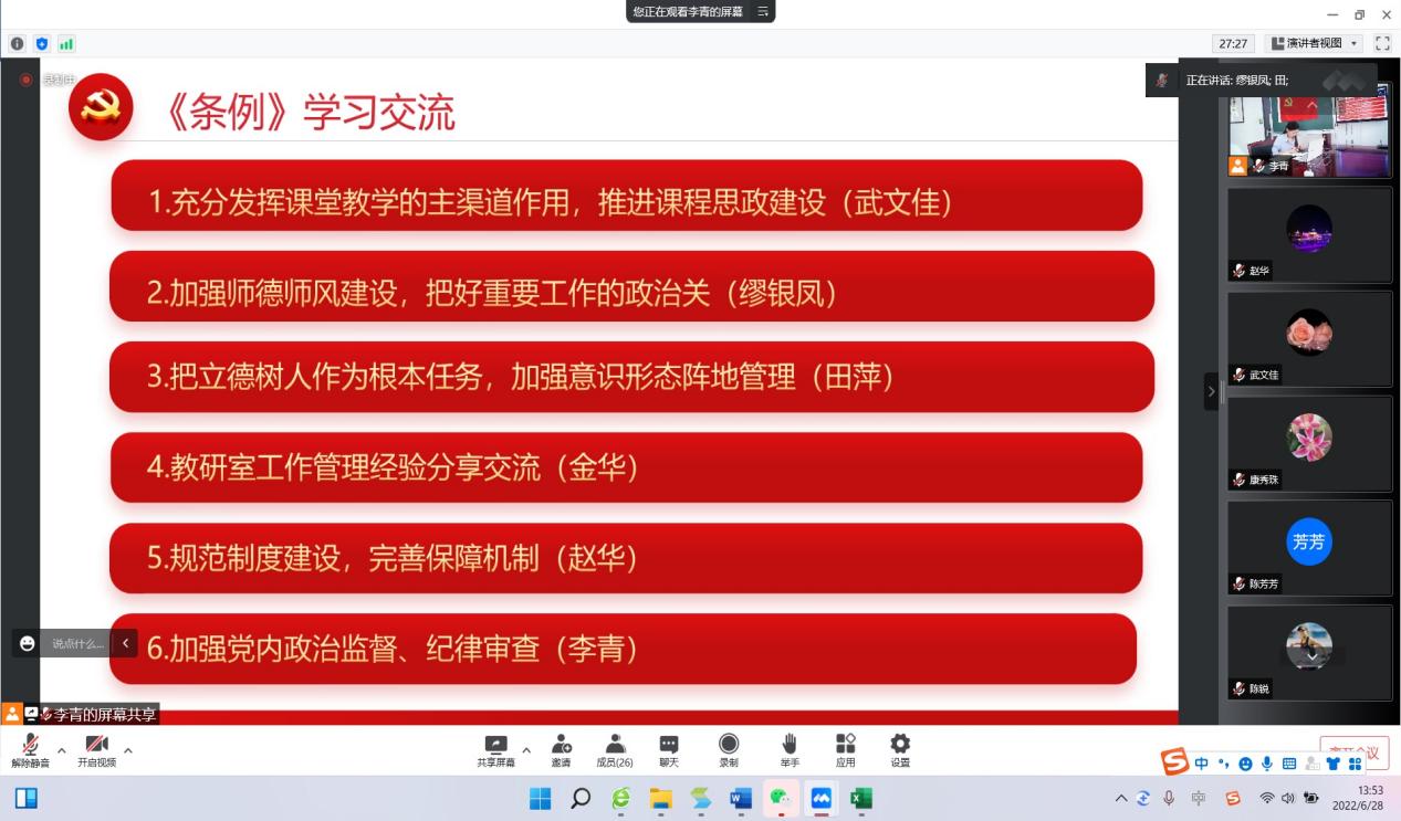 通过学习,党员们纷纷交流了自身学习感悟。高等数学教研室主任武文佳就如何充分发挥课堂教学主渠道作用、推进课程思政教学改革等做了经验分享;工程数学教研室主任缪银凤交流了自己对于加强师德师风建设,如何把好重要工作政治关的学习心得;人文美育教研室主任田萍分享了自己对于如何实现立德树人,加强意识形态阵地管理的学习感想;物理教研室主任金华结合工作实践进行了教研室日常管理工作的经验分享;学院直属党支部委员赵华和李青分别就《条例》中关于如何规范基层党组织制度建设,完善保障机制和加强党内政治监督、纪律审查工作谈了自己的学习感想。