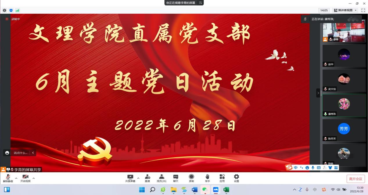 在中国共产党成立101周年、“七一”党的生日到来之际,文理学院直属党支部于6月28日组织新老党员开展“迎七一云宣誓”主题党日活动。