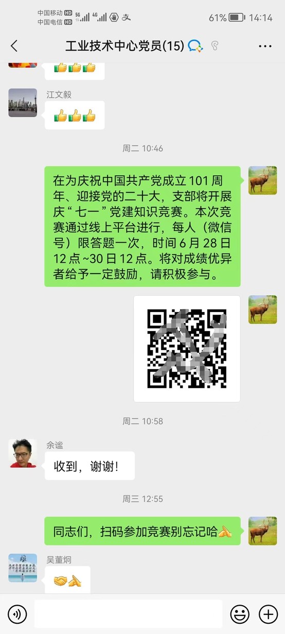 为持续开展“党史”学习教育,巩固深化学习效果,感受党的光辉历史,传承红色基因,继承和发扬党的优良传统和作风。6月28日,在庆祝建党101周年之际前夕,工业技术中心直属党支部举办了庆“七一”党建知识竞赛主题党日活动。本次竞赛通过线上平台进行,支部全体党员和入党积极分子参加了竞赛答题。