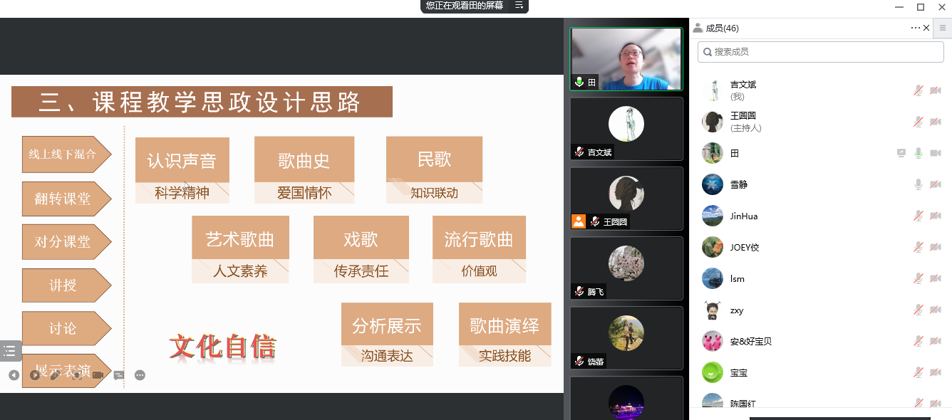 田萍老师通过引入问题、激发思考、艺术创新、校外实践等方式,在《声乐赏与唱》教学实践中融入思政元素,将音乐素养的培养与学生生活联系起来,提高美育课程的实践性和情境性。