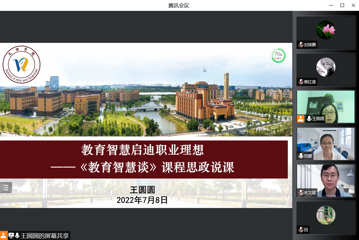 为进一步落实立德树人根本任务,充分发挥课堂教学育人的主渠道、主阵地作用,促进基础课程教育与思政教学有机融合,自6月初以来,文理学院顺利开展“课程思政主题月”活动。7月8日,主题月收官活动——“文理学院课程思政教学设计评比展示”以线上方式举行,特邀学校党委办公室主任、首批校级课程思政教学团队负责人董雪静,教务处副处长饶蕾,资深教授刘三明担任评委,文理学院院长朱泰英、直属党支部书记康秀珠、全院教师及兄弟学院相关教师参加本次活动,活动由副院长吉文斌主持。