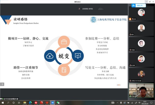开营仪式由李靖超副院长主持,蔡骋院长从学校及学院的发展历程和概况,历史沿革、学科建设、师资队伍、科学研究、学术成果、人才培养和国际交流等方面进行了详细介绍。2019级优秀硕士毕业生史可欣、徐柯妮两位同学,分别从研究生生活、学习、科研以及人际交往等方面向营员们分享了自己的读研感悟,让营员们对于上海、上海电机学院以及电子信息学院有了更加美好的憧憬。