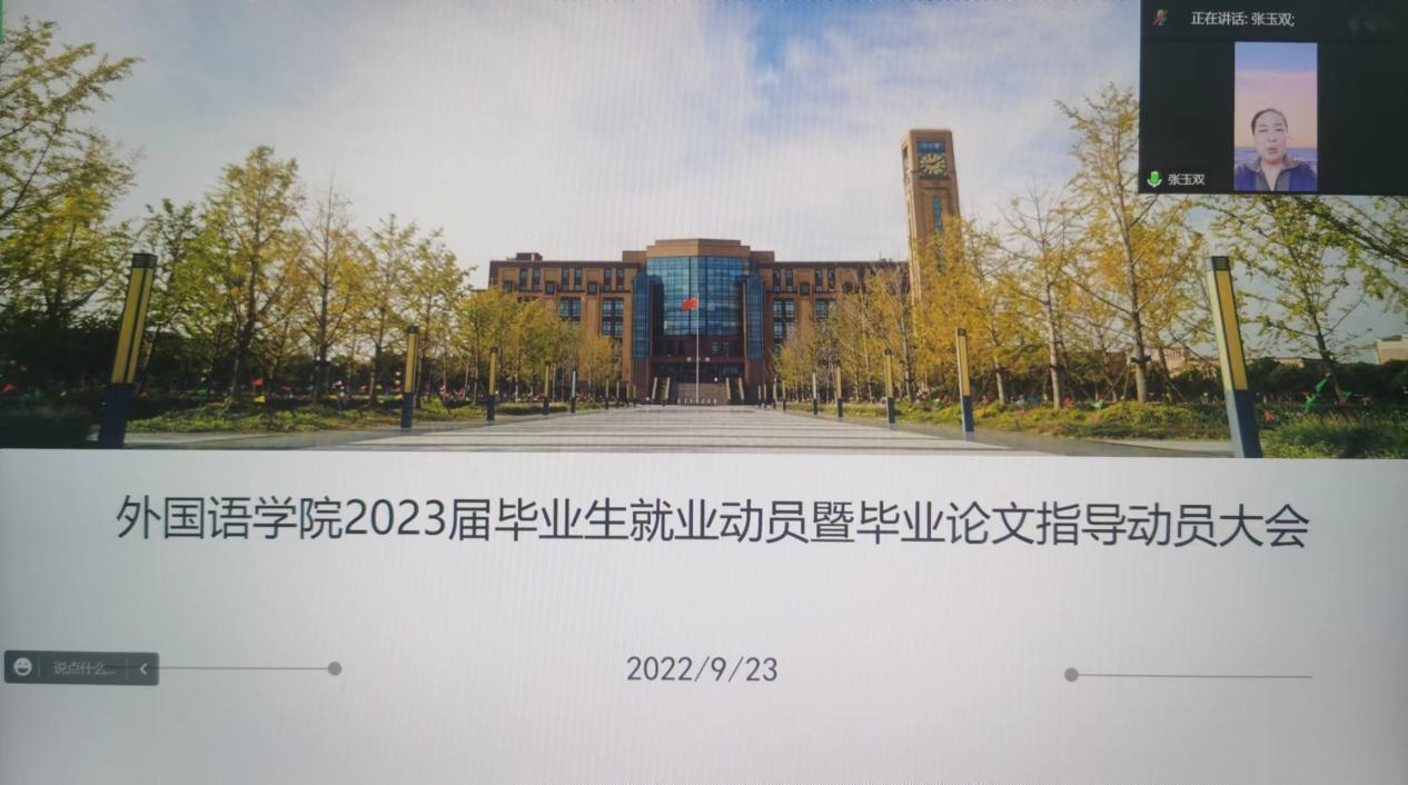 2022年9月23日外国语学院就业动员暨毕业论文指导动员会议在线上顺利开展,外国语学院院长张玉双,党总支副书记、副院长甄一捷,各系部主任、毕业班辅导员、2023届全体毕业生以及家长参加本次会议。