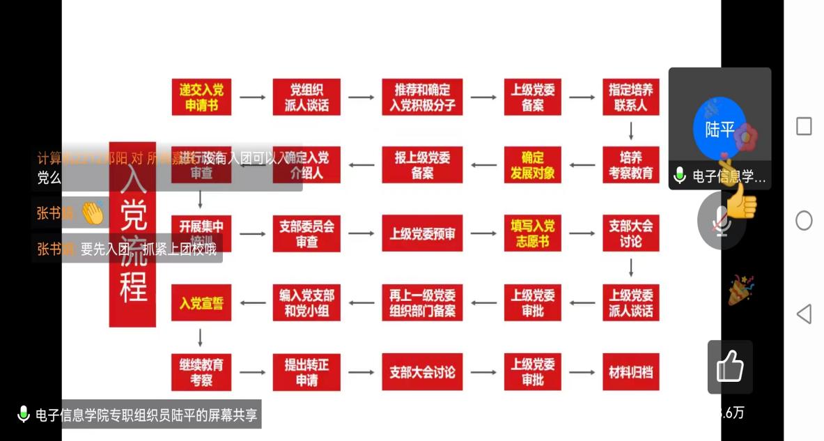 为强化学生的理想信念教育,激发学生政治热情和入党意愿,引导新生端正入党动机,了解入党流程,积极向党组织靠拢,电子信息学院于9月28日晚18:30,通过线上线下相结合的方式,组织全体新生开展入党启蒙教育,上好新生政治信仰第一课。