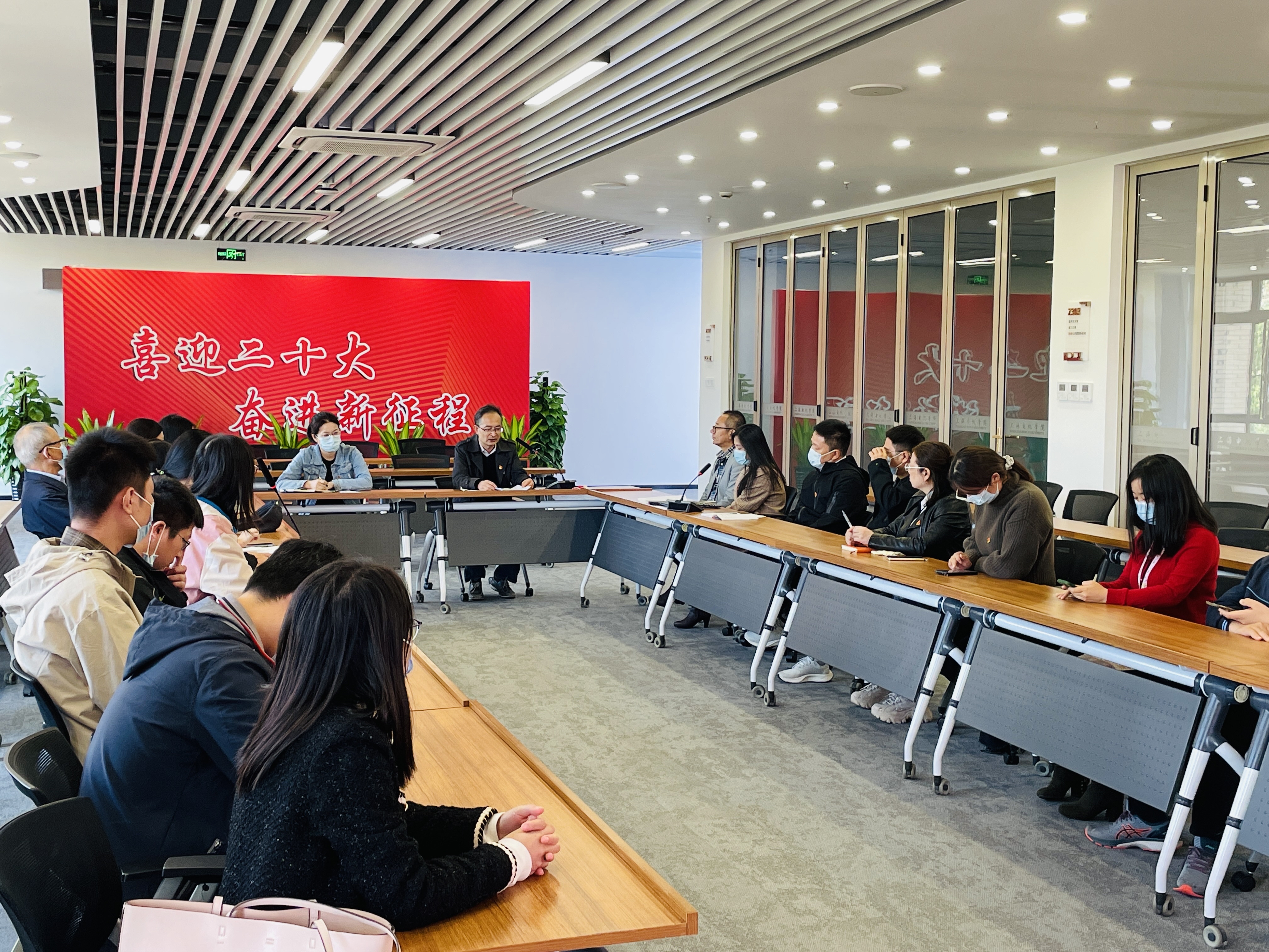在党的二十大胜利召开之际,材料学院直属党支部迅速掀起学习宣传贯彻党的二十大报告热潮。10月19日,材料学院直属党支部联合宜浩佳园二居民区党总支部共同开展“学习领会二十大精神,奋进新征程”主题党日活动。南汇新城镇宜浩佳园二居民区党总支书记(主任)张卫、材料学院直属党支部书记徐荣华、材料学院院长李荣斌以及材料学院全体党员师生,部分发展对象和宜浩佳园二居民区党总支党员参加了此次活动。