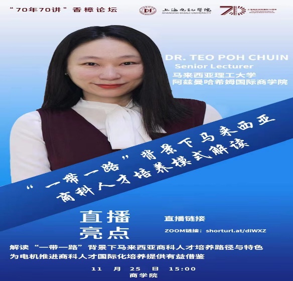 为进一步丰富校园文化活动,搭建学术交流平台,拓宽学校国际化发展路径,11月25日下午,商学院开启校庆“70年70讲”香樟论坛系列讲座第一讲,邀请马来西亚理工大学阿兹曼哈希姆国际商学院高级讲师TEO POH CHUIN博士作题为“‘一带一路’背景下马来西亚商科人才培养模式解读”的专题报告会。商学院近百位师生参加了此次活动。