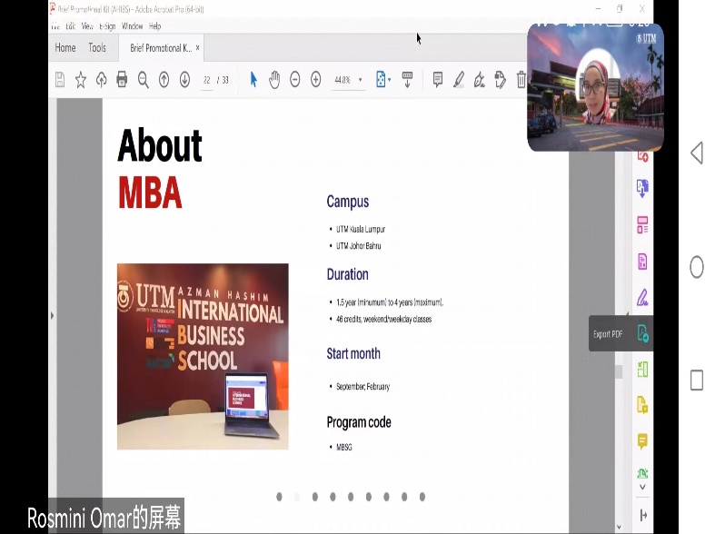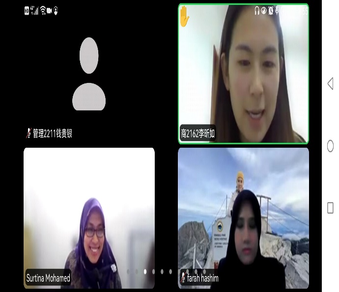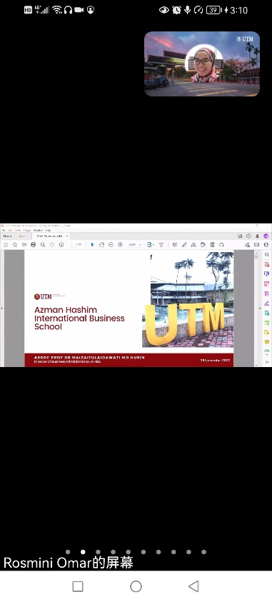 主讲嘉宾从学科建设、人才培养以及社会认可度等多个方面,诠释了马来西亚理工大学在中国同周边国家共建“一带一路”的大背景下取得的新发展,介绍了因民族融合而极富特色的马来西亚文化,着重解读了该校工商管理硕士(MBA)项目的教学环境、学制时间以及项目分数要求等相关内容。随后,Farah Farhanah Hashim、Zulfikar Abdul Rahim以及Ts.Ikmalaizat Smada三位项目在读学生分享了自己的项目学习认知、课堂交流体验以及修读该项目的社会价值等。与会学生代表同嘉宾进行了深入交流,并通过线上平台合影留念。