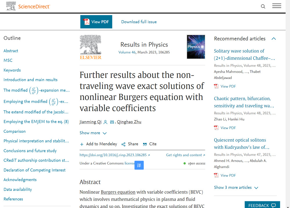 该研究成果以“Further results about the non-traveling wave exact solutions of nonlinear Burgers equation with variable coefficients”为题,发表在国际SCI期刊《Results in Physics》(JCR一区,中科院2022年升级版2区)上。《Results in Physics》期刊是国际著名出版商Elsevier为聚焦物理学领域相关的原创性科研成果而创办的学术期刊。上海电机学院商学院是该成果的唯一完成单位,戚建明老师为该论文的第一作者和通讯作者,朱清昊同学为第二作者。(供稿:科技处)