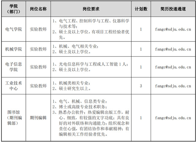 2.应聘者填写标准版简历,链接地址如下:https://hr.sdju.edu.cn/2017/0104/c1689a25017/page.htm,连同相关资料(学历、学位、专业技术职称、获奖证书、科研成果的复印件等)发送至相关邮箱(注: 邮件主题格式:应聘岗位-姓名-专业);