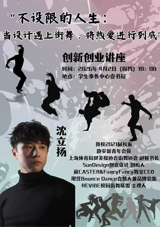 沈立扬,我校2021届校友、静安新青年会员、上海体育局健美操协会街舞协会 副秘书长、SunDesign创意设计创始人、前CASTER&FancyFancy舞室CEO、现任Bounce Dance合伙人兼品牌总监、REViBE校园街舞联盟主理人。
