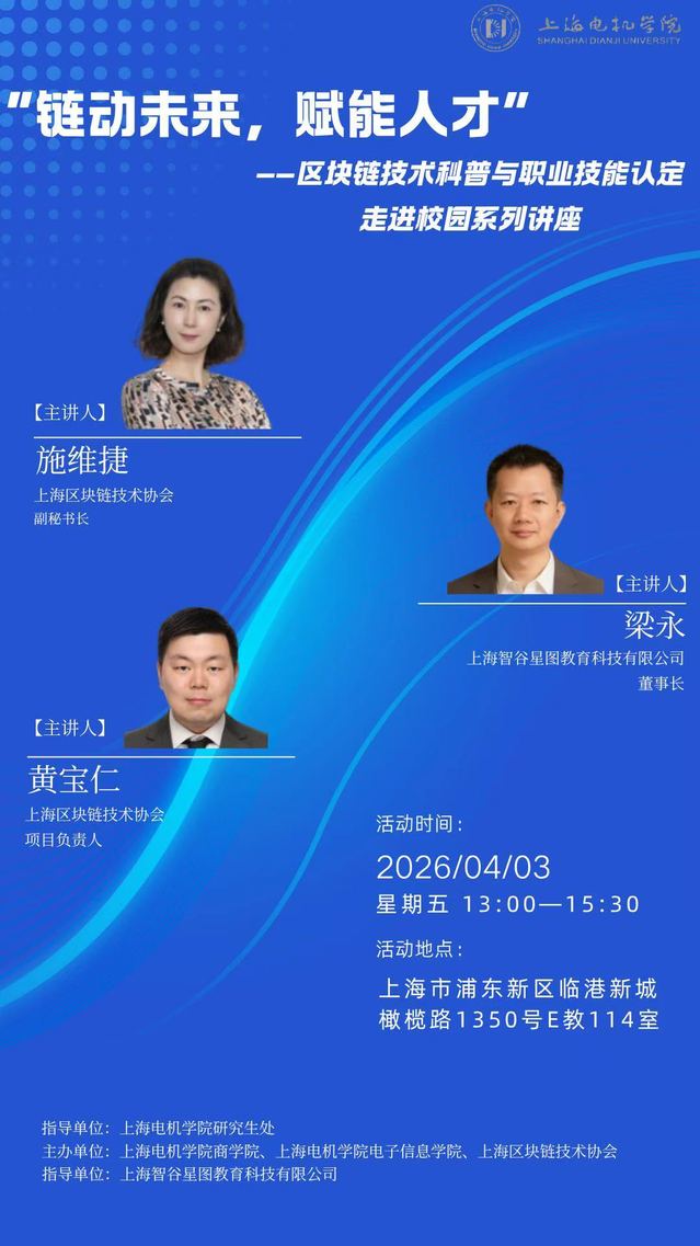 随着区块链技术上升为国家战略,各行业对区块链人才的需求日益迫切。上海区块链技术协会作为行业引领者,致力于推动区块链技术普及与人才培育。上海电机学院商学院积极对接新兴产业,计划通过本次宣讲活动,向学生普及区块链基础知识,介绍区块链应用操作员职业技能认定,架起产调融合的桥梁,为学生未来的就业与发展提供更多机会与选择。